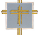 The Triparted Cross represents the Trinity. It is comprised of three vertical and three horizontal arms, all of equal length and arranged in such a way that their intersections resemble basket weaving, each piece integrated with the others in a woven center. The resulting twelve arm ends can also correspond to the twelve Apostles.